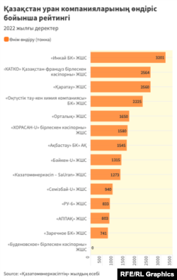 • Шетелдіктермен бірлескен 12 кәсіпорынның (БК) тең жартысының ортақ құрылтайшылары – "Росатомның" еншілестері. Ресей мемлекеттік корпорациясы Қазақстандағы 14 кен орнының бесеуінен уран өндіреді.