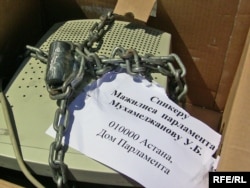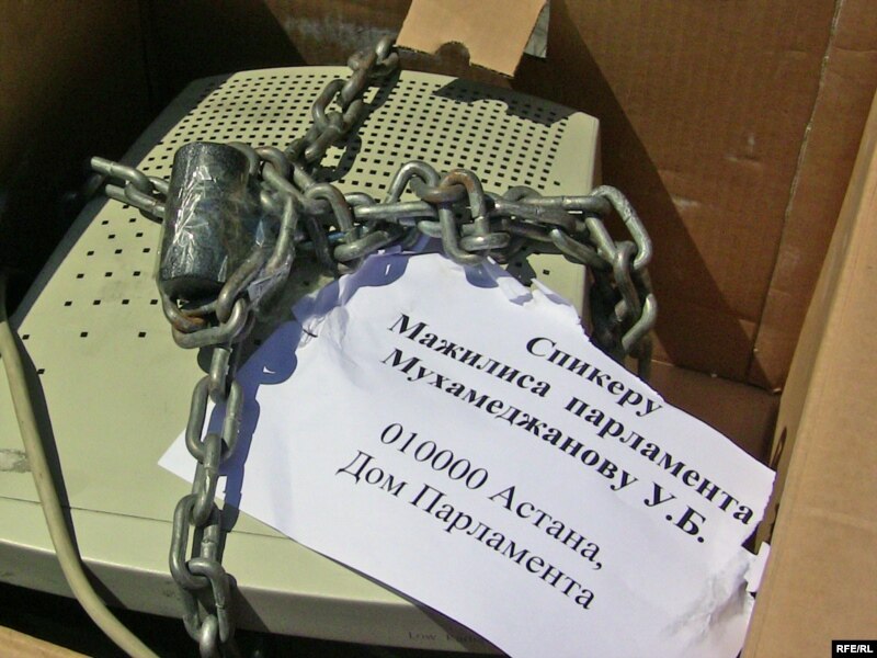 «Еркін интернет үшін» қозғалысы мен сөз бостандығын қорғаушы «Әділ сөз» қоғамдық қорының белсенділері, интернет-сайттарды реттейтін заң жобасының бірінші оқылымда қабылдануына наразылық ретінде, шынжырланған компьютерді парламент мәжілісінің спикері Орал Мұхамеджановқа сәлемдеме етіп жолдады. Алматы, 29 сәуір 2009 жыл.