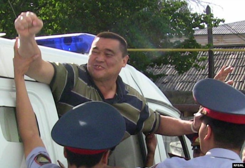Үш жылға түрмеге кесілген «Алма-Ата инфо» тәуелсіз газетінің бас редакторы Рамазан Есіргепов сот үкімі шығатын күні. Тараз, 8 тамыз 2009 жыл.