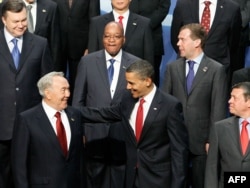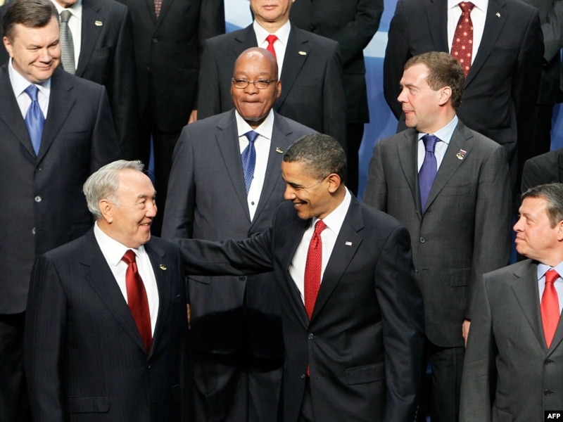 АҚШ президенті Барак Обама мен Қазақстан президенті Нұрсұлтан Назарбаев (бірінші қатарда) ядролық қауіпсіздік жөніндегі саммитке қатысқандардың бірлесіп суретке түсуі сәтінде. Вашингтон, 13 сәуір 2010 жыл.