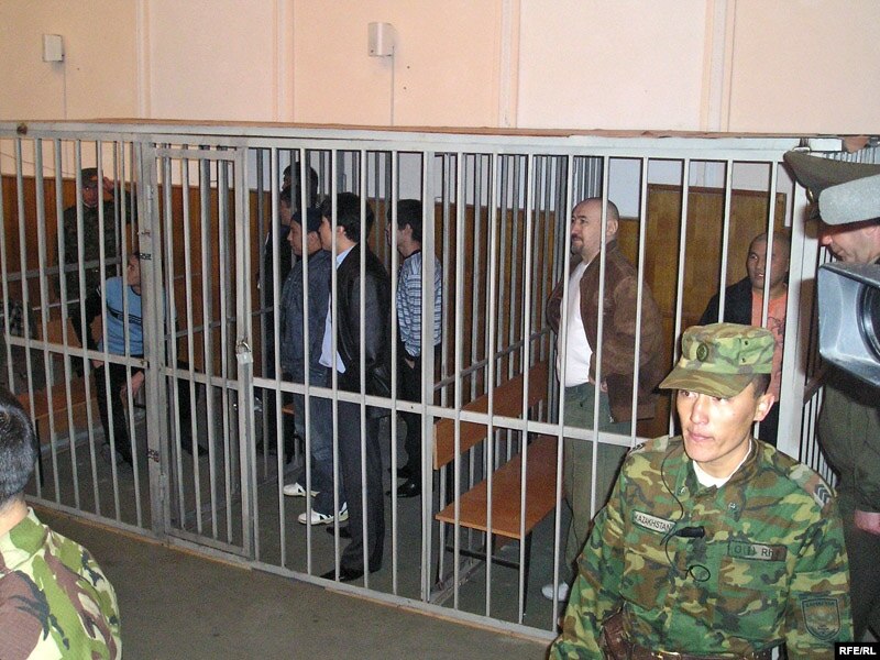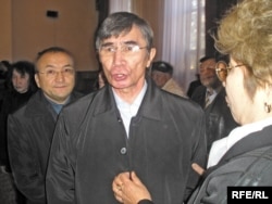 Қоғамдық қорғаушы Жасарал Қуанышәлин (ортада) залдағы орындарға отырып алған құқық органдарының қызметкерлерінен орынды айыпкерлердің сыртта қалған туыстарына босатуды талап етіп тұр. Алматы, 5 қазан 2007 жыл.