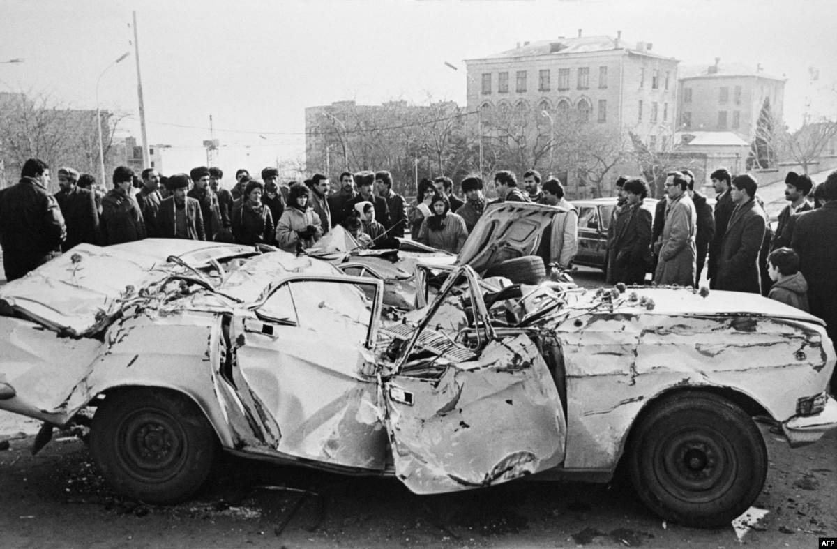 Баку тұрғындары оқ тиген көліктің маңында тұр.